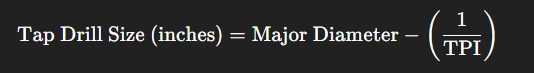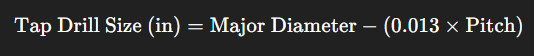 → Tap Drill = 0.25 − (0.013 × 0.05) ≈ 0.201 in (#7 drill)